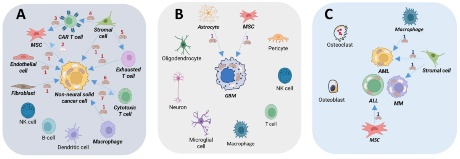 Přenos mitochondrií mezi buňkami v nádorovém mikroprostředí. A: Pevné nádory s výjimkou nádoru nervové soustavy; B: Nádory nervové soustavy; C: Hematologické nádory.